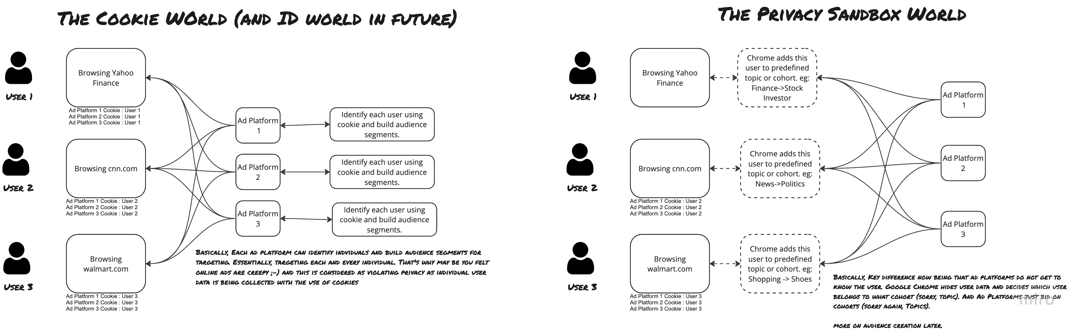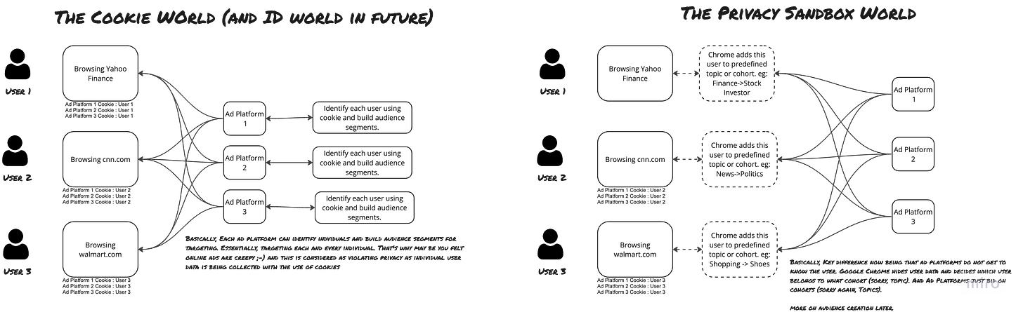 Privacy Sandbox is an attempt by Google to provide a solution to facilitate personalized advertising or targeting advertising in somewhat similar way as it exists today while still taking away the 3rd party cookie from the system. In a simple language, remove the support for 3rd party cookie (data) and build cohorts ( groups similar users) to facilitate targeted advertising on these cohorts rather than individuals. By this change, all the advertisers (and related parties like SSPs, DSPs, DMPs and such platforms) will not be able to leave their trace (3rd party cookie) on the user device so that they can look back at it to identify user. Look at the oversimplified diagram below.